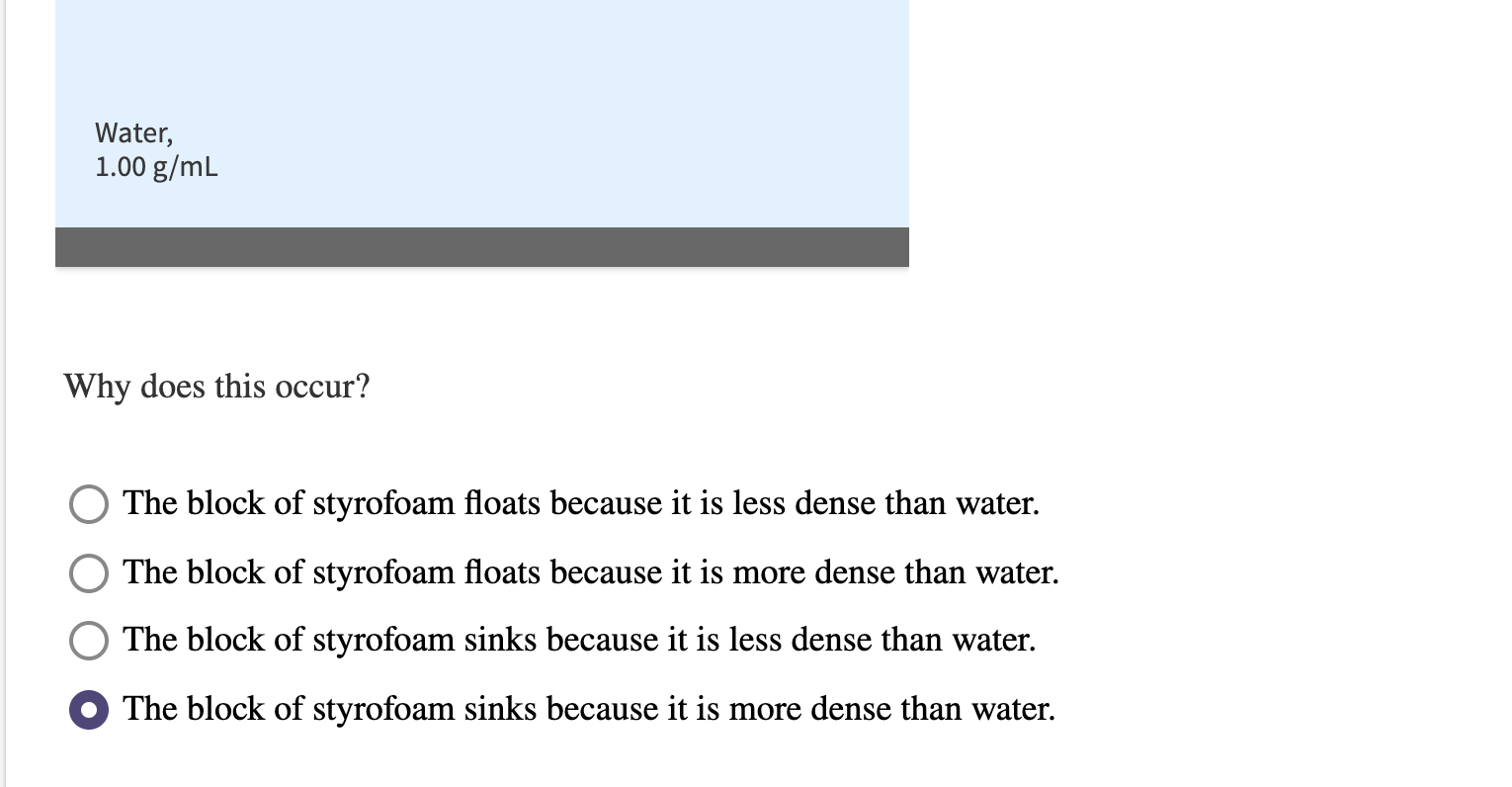 A block of Styrofoam floats on water while a lead block of the same size block lies submerged in the water. The buoyant force is greatest on the. Using the simulator grab the various blocks lift them over the water and drop into the water a few times.